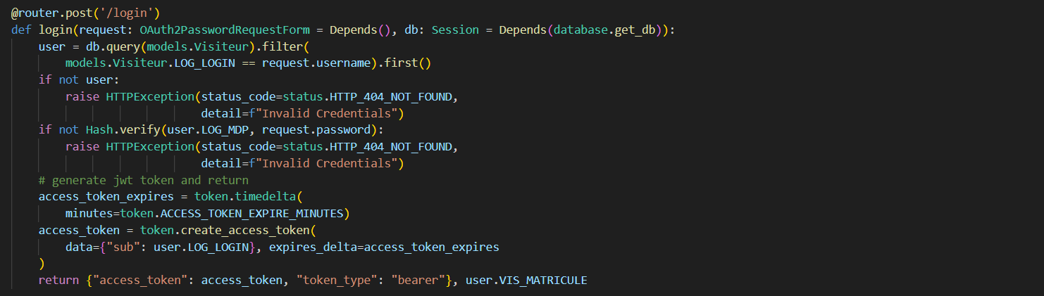 On a besoin d'un login et d'un mot de passe qui proviennent de la table Visiteur dans les champs LOG_LOGIN et LOG_MDP si la combinaison du login et du mot de passe haché correspondent à un enregistrement dans la base de données alors la route qui est "/login" nous renvoie un token qui est de type JWT (JSON Web Token). Ce token permet d'être identifié par l'API et donc de pouvoir envoyer des requêtes et reçevoir des réponses. L'API est sécurisée par ce token c'est à dire que si un utilisateur essaie d'utiliser les routes de l'api sans être authentifier et en possession du token, l'API n'est pas accessible.