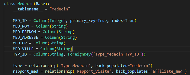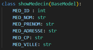 Les images ci-dessus sont les exemples du "model" Medecin, qui représente donc la table "Medecins" de la base de données ainsi que le schéma "showMedecin" qui est utilisée dans les routes "/medecins" et "/medecin/id". Le schéma indique donc à l'API ce qu'elle doit retourner.
