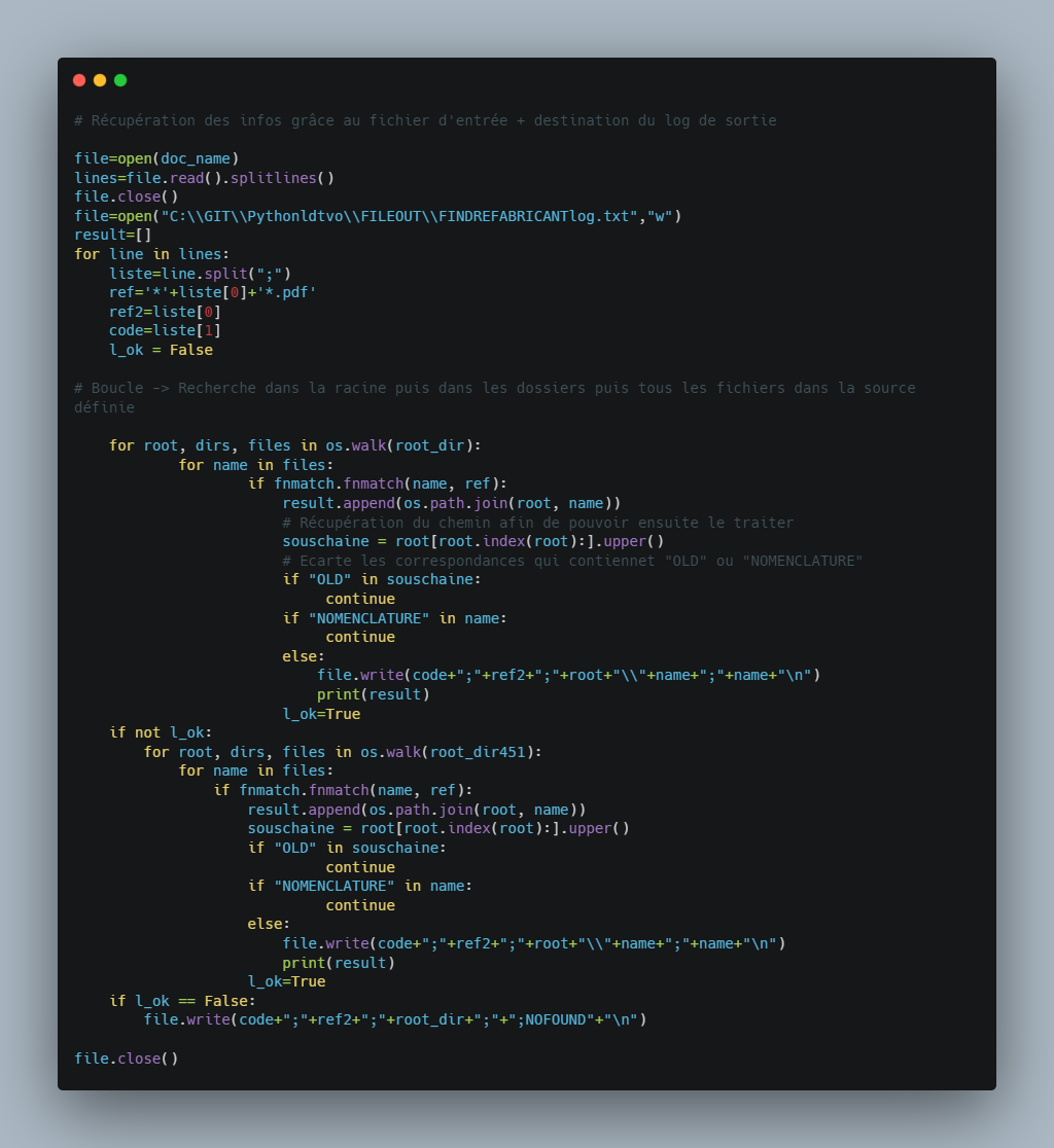 Pour ma première mission j'ai du faire un programme en Python. L'objectif de celle-ci était de vérifier l'existence sur le réseau de fichiers référencés dans la BDD existante (et de fournir la liste des anomalies au bureau d'étude pour les corriger) et de les renommer selon une nouvelle norme de nommage cohérente en vue de la refonte du SI concernant la gestion des nomenclatures. Aujourd'hui, on a un applicatif fait à base de formulaires Access et des fichiers stockés sur notre serveur interne. A terme, on va basculer vers une solution web, hébergée chez AWS (Amazon). Le développement web est assuré par un presta externe, mais nous avons en charge en interne de définir la structure de la nouvelle BDD, et donc d'assurer la migration de l'existant (données + fichiers) vers le nouveau système. ← Voici les exemples des différents programmes que j'ai pu réalisé.